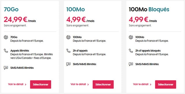 Si vous recherchez un forfait à bas prix sans être forcé de poursuivre les séries limitées, il y a d’autres options. C’est le cas par exemple de l’offre Sosh 100 Mo qui est à seulement 4€99 par mois. Disponible à ce prix tout au long de l’année, c’est le forfait mobile à moins de 10 euros Sosh par excellence. Il s’adresse avant tout aux personnes qui n’utilisent pas trop fréquemment leur forfait. Avec, vous avez une enveloppe de 100 Mo suffisant pour vérifier vos mails et vous connecter de temps à autre. 💪